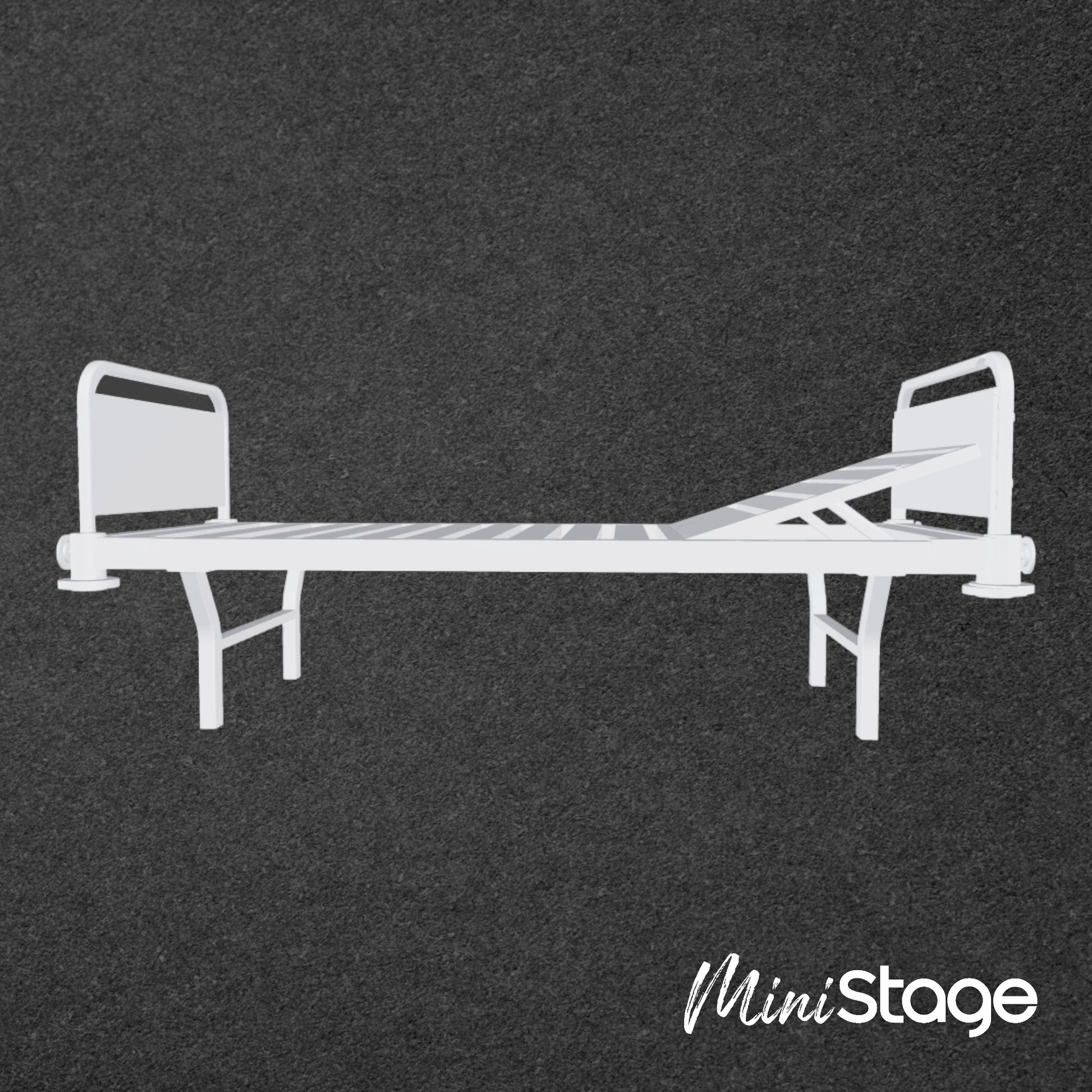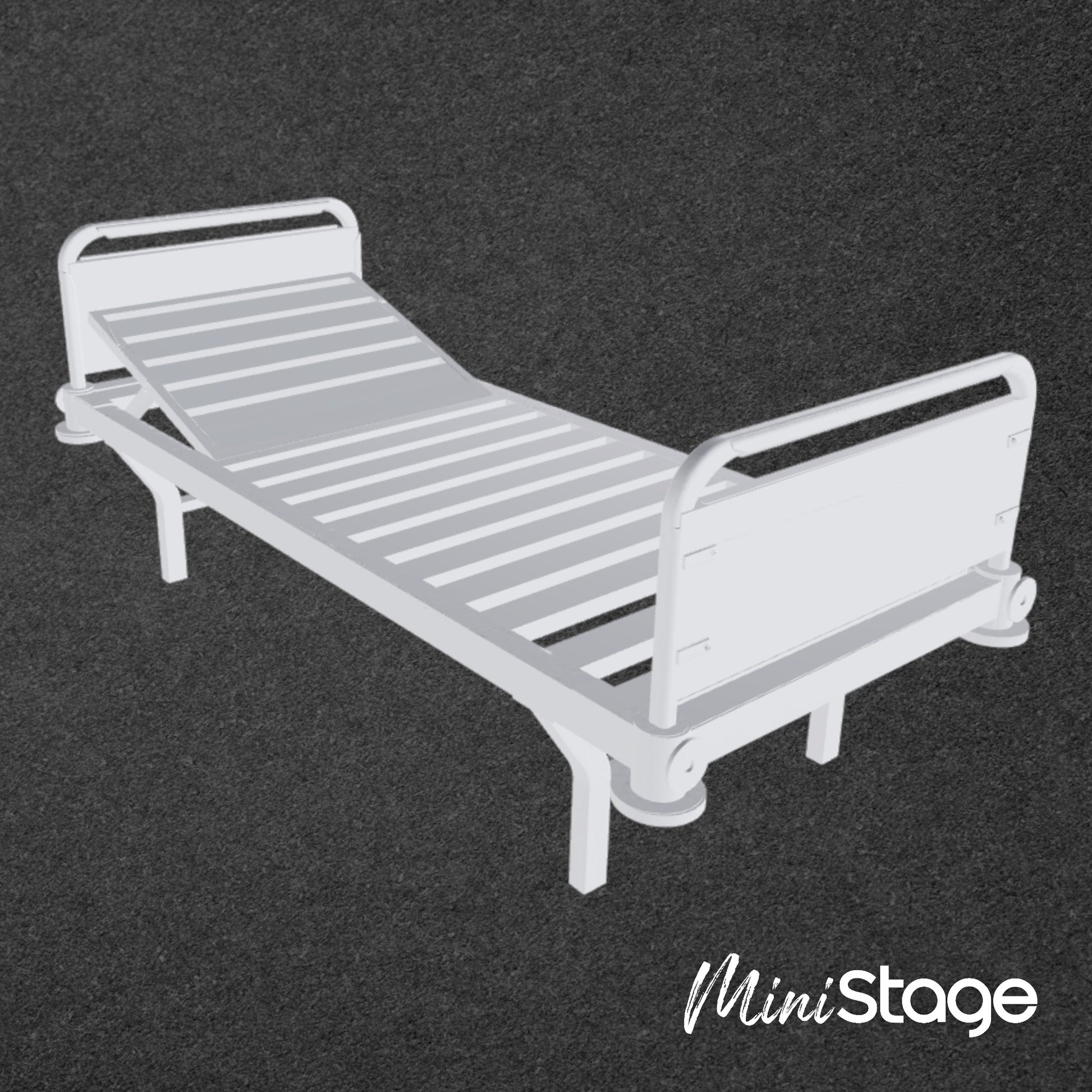 This is a scale model of a Hospital Bed without a matress. The model is designed for use in theatre model boxes and presentations and is 3D printed from resin in the UK.