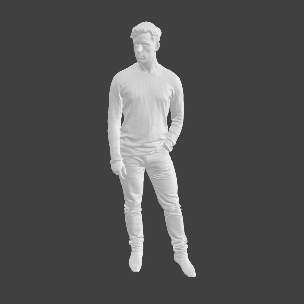This is our high poly scale model of a male standing wearing jeans and a jumper, with his left hand in his pocket.